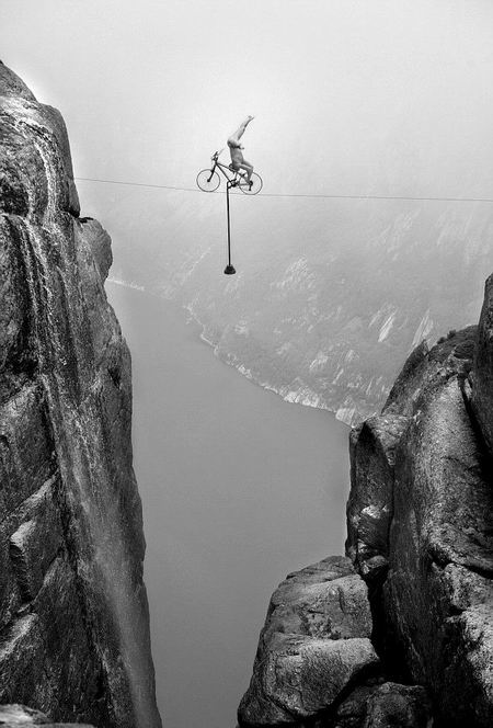 赤身裸体倒立骑自行车悬崖峭壁间走钢丝 挪威男子 千米高空施展绝技