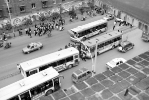 ▲逆行的2路公交车(图右)和8路公交车撞个正着,2路公交车车头底下还有一辆电单车记者 张玉杰/摄