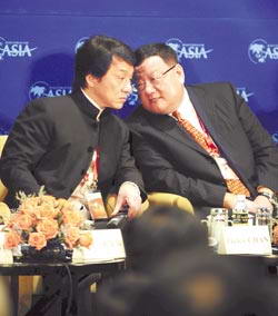 成龙在博鳌论坛批评港台两地太乱,引发绿营要求撤换其听障奥运形象大使。图为成龙(左)在论坛上与凤凰卫视总裁刘长乐交谈。