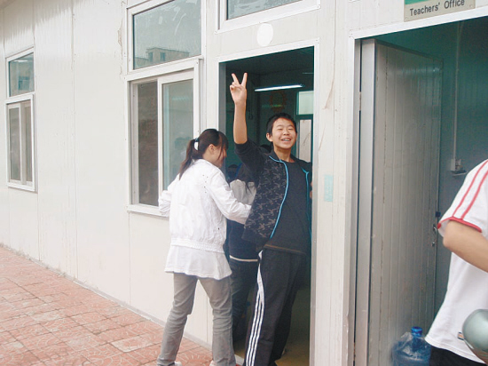 如果不是绵阳外国语学校教学楼上永远定格在14时28分的蓝色时钟,如果没有校园操场上成排的板房,我们根本看不出这是一所曾经遭遇地震摧残的学校。