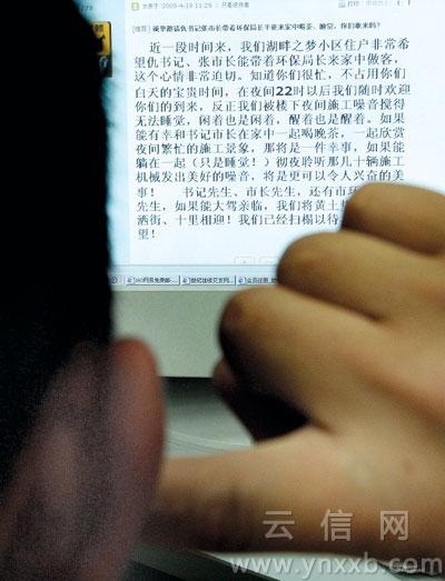 到昨天下午5时,“内陆河”的帖子共有15个跟帖,网民ywd1留言说:“昆明现在无处不在大搞建设,噪声、灰尘等污染简至(直)就是家常便饭,看来ZF精力不在这方面上!”