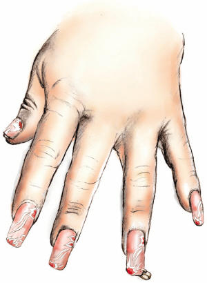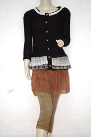 女子20岁左右,身高150厘米左右,体型中等偏瘦,上身外套为QIAOLIJIAFANG牌黑色镶白边带格子线衫,下穿土黄色裤子,头发黑色过肩,佩戴圆形白色耳环,十指染有粉色美甲,左手无名指指甲上挂有一小饰品,脚穿34码JIAOLITE牌土黄带绿色鱼嘴女式皮鞋。