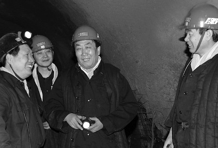 济宁能源发展集团董事长王彦伦(右二)在井下与职工亲切交谈。