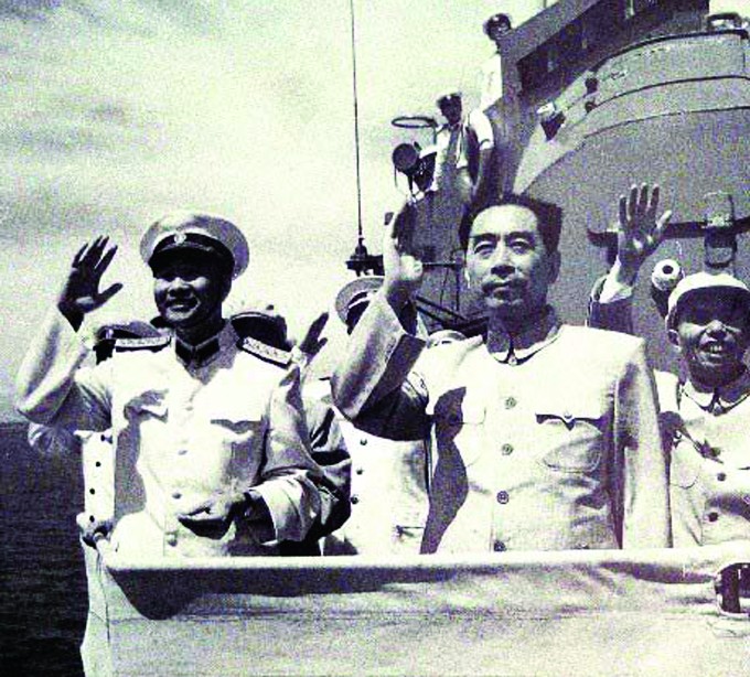 接着,身着银灰色中山装的周总理乘坐检阅舰驶出大港。