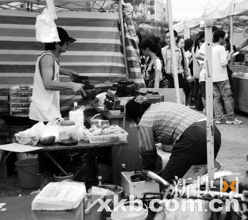 近日,大学城内的大三学生小黄向本报反映,博联超市入口处两端架起了十多个黄色的雨棚,原先在路边摆摊的“走鬼”档纷纷进驻其中,每天下午5时30分准时开档。4月19日傍晚,小黄在其中一个烧烤档吃了一串鱿鱼,当晚肚子疼痛难忍。他跑去医院检查,确诊得了“急性肠胃炎”。“我那天跟同学一起,但她没有吃鱿鱼串。我吃了一串,没想到会拉肚子。”小黄懊悔地说。