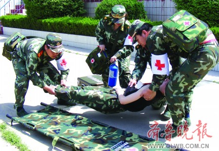 26日上午,武警山东总队卫勤应急保障分队近百名指战员,在武警山东总队训练基地进行了一场迎全运卫生应急大演练。