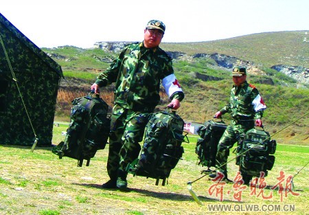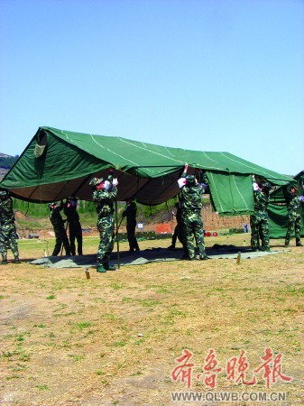 “一,二,三,起……”一声号子,五座迷彩军用帐篷拔地而起。几百名佩戴红十字白袖章的战士分成六组:抢救分类组、抗休克组、手术组、医技组、留观后送组、生化救治组。一个小有规模的野战医院展现在人们面前。