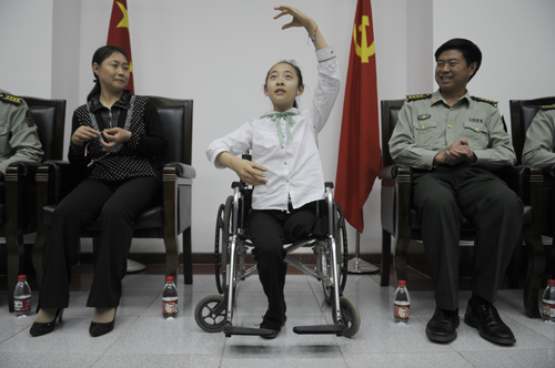 昨天一天,李月在解放军昆明总医院医护人员的陪同下,和母亲一起检查了身体,去花市买了鲜花,感受了昆明的阳光。一天里,小姑娘都快乐地笑着。在解放军昆明总医院为她举行的欢迎会上,李月坐在轮椅上一直腼腆地笑着,她告诉在场的人:“非常感谢大家,来到这里感觉很亲切,像是到了家。当初做的决定让我能这么好地活着。”说出了自己的心里话,小姑娘在轮椅上又给医疗队的医生们表演了在残奥会上的几个舞姿,并和母亲唱起了羌族歌曲。她的舞和歌,赢得了一片掌声。