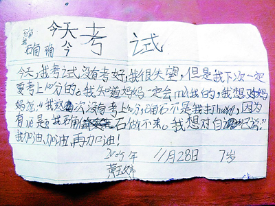 黄玉婷所有的奖状和作业本都被埋在了废墟里,如今所能够找到黄玉婷留下的唯一的文字,是她写给妈妈的一份“检讨”,歪歪扭扭的汉字中夹杂着汉语拼音:“今天,我考试没有考好,我很失望,但是我下次一定要考上100分的。我知道妈妈一定会mà(骂)我的,我想对妈妈说:‘我这次没有考上100分,确石(实)不是我打huang(慌),因为有xiē(些)题我确石(实)做不来。’我想对自己说:‘我加油,加油,再加油!’2005年11月28日7岁黄玉婷”。