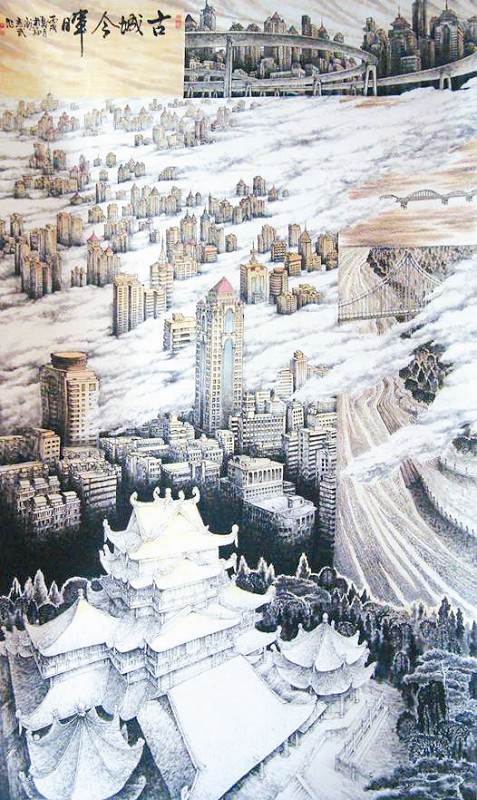 三位画家分别来自福建、新疆、河南。陈志武用意向山水的绘画手法,表现了海上丝绸之路;宋献涛则将塞外风光、驼铃古道发挥得淋漓尽致;陈子贞以传统的山水风格技法,展现中原山水。市民可免费参观(图为陈志武画作)。