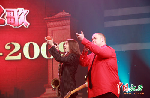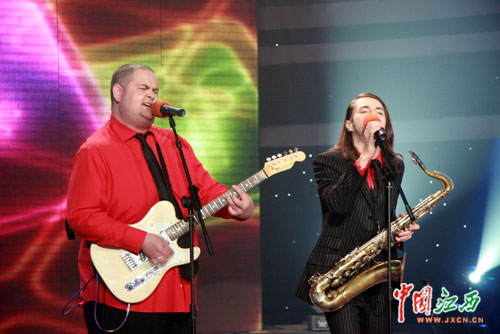 俩人有着中西混搭式的幽默,当主持人问他们要唱什么歌时,两人一起做了一个举枪打靶的动作,引得观众哈哈大笑。(江西网记者 邱辉强 摄)