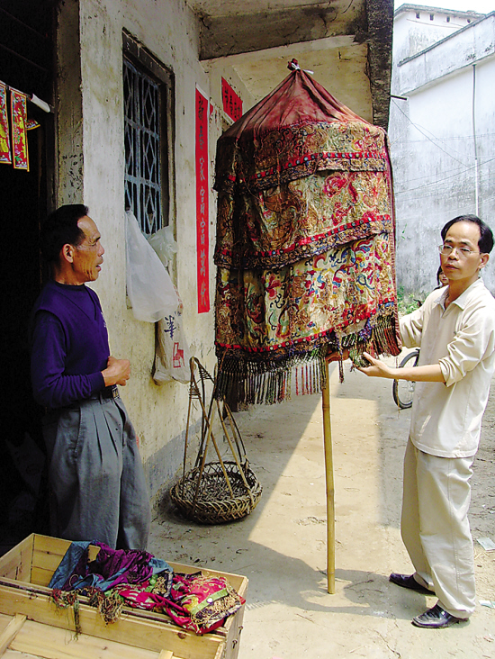 记者见到,两顶官伞里衬均是纯麻布,外层分别用白、红、黄三种优质绸布缝制而成,外表绣有狮子、龙、凤和牡丹花等物;伞撑开时,高约1.2米,直径0.8米。