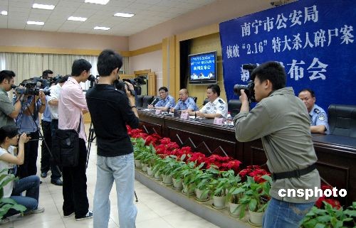 四月三十日,轰动广西首府南宁市的“覃氏三姐妹惨遭碎尸”案宣布告破,南宁市公安局就此举行新闻发布会。二00九年二月十二日,家住南宁市西乡塘区的覃女士向公安机关报案,称其住嘉州华都小区的三个妹妹在二月十日晚失踪。十六日,公安机关在南宁郊区发现多个散发恶臭的袋子,所装之物为被肢解的尸块,经法医鉴定,属失踪的三姐妹。南宁市公安局官员在发布会上介绍,犯罪嫌疑人兰某乃三姐妹对门的邻居,因工作及感情生活不如意等,欲强奸女性宣泄欲望,事后怕行径败露,兰某遂一一杀死覃氏三姐妹并肢解抛尸郊外荒野。中新社发 王刚 摄