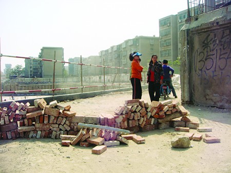其实一建宿舍还有一条出路,西邻研究所宿舍还有一条临时通道。“施工方把泄洪沟填了,修了这么一条道。”一建宿舍的居民说,“但是因为研究所宿舍和施工方也有矛盾,现在研究所的居民把路堵上,所以现在无路可走了。”