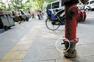 因为该装置外面包有一个黑色皮套,所以只能看见有水正不断从里面滴出来。“一般不需用水时,摊主都会用皮套把这个装置封起来。”附近住户李先生所说的“摊主”,即是在该消防栓旁边的一家修车摊点老板。“要不是曾经多次看见过该摊主拿着改锥、扳手在摆弄这个装置,我也不敢说就是人家整的。”李先生说,该摊主修车需要用水时,就拿着工具简单搬弄几下后,水便会哗哗的淌出来。
