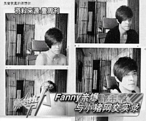 据台湾某周刊报道,一名自称Fanny的女网友,将自己与罗志祥网上聊天的“露骨”的私密内容,包括文字对话、视频截图等等全部爆料给周刊,其中还有罗志祥曾光着上身的图片。据称由于该女子神似前女友Selina,罗志祥不禁陷入情网,双方互动3个月聊MSN、发短信。Fanny还自称去过罗志祥的家,对方曾发给自己的手机短信,亦如同情侣般甜蜜。