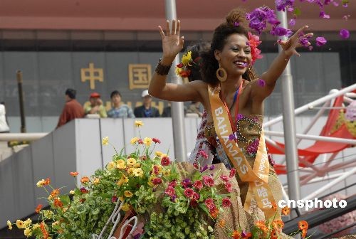 “2009中国昆明国际文化旅游节”5月1日在昆明世博园隆重开幕,正在昆明参加全球小姐国际城市形象大使大赛的近40个国家的佳丽参加了开幕式,为旅游节添色不少。图为菲律宾和尼泊尔等国的环球小姐向游客挥手致意。中新社发 杨洋 摄版权声明:凡注有“cnsphoto”字样的图片版权均属中国新闻网,未经书面授权,不得转载使用。【更多图片】