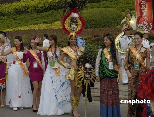 “2009中国昆明国际文化旅游节”5月1日在昆明世博园隆重开幕,正在昆明参加全球小姐国际城市形象大使大赛的近40个国家的佳丽参加了开幕式,为旅游节添色不少。中新社发 杨洋 摄