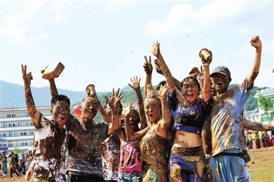 5月2日,居住在云南沧源佤族自治县阿佤山的佤族同胞,与来自全国各地游客共度为期4天的“中国佤族司岗里摸你黑狂欢节”。他们用天然原料配制的“娘布洛”涂料,相互涂抹,互致平安,祝福健康!