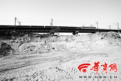 在郑西货运铁道专线沿线,记者看到一个沙场,开采界面离桥墩不到500米,采沙深达6米以上。
