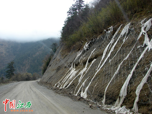 车辆缓缓驶进灾区,道路两侧山体已加上铁网,以防碎石滚落。(江西网记者 周泽锋 摄)