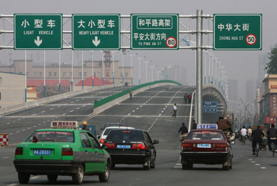 “和平路高架桥上的交通标志牌是绿色的,其他路段为蓝色,这是因为桥上设计时速每小时80公里,是城市快速路。其他路段属于主干路,设计时速60公里每小时,不属于快速路,所以不用绿色交通牌。”和平路高架桥定位为城市快速路,绿色路牌表示出了这一概念。