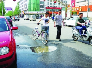 记者立刻赶往现场,看到自行车道上有一口下水井的井盖已不知去向,井里的水距离井口不到半米。环卫工人张师傅告诉记者:“昨天早上我打扫卫生的时候,发现这里的井盖丢失了,就在井口立了两块砖头,提醒人们经过这里要小心,一旦不小心,掉下去可不得了。”从第三干休所出来的王先生告诉记者,这条路是通往三干所的必经之路,这条道路上车流量大,车速快,过往的司机都要小心地绕开这口井,稍不留意车轮就可能被卡在其中,夜晚光线不足,不熟悉路况的司机更有可能发生危险。