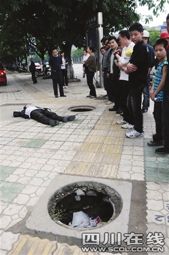 出事的无盖窨井位于南充城区金鱼岭路和正阳路交会的地方,两个窨井相距不到三米,一个窨井就在盲道上,井底较浅,里面堆满了垃圾,另一个较深,在两条盲道拐角处,里面有很多污水,水面还露出许多线缆。“太吓人了,跳过了第一个洞,没想到又有一个!”唐军民说,当时他们幸运地跳过了第一个窨井,他还在提醒大家小心脚下有“洞”,边走边说,没想到,左手边的刘泽勇的手臂一下子滑落。唐军民一手抱着娃娃,腾出一只手,蹲下来在地面晃动,他摸到了一个窨井口,“救命啊!”窨井传出刘泽勇的呼救声,唐也跟着呼救。这时街对面跑来一名男子,和唐一起将刘泽勇拖上来,刘全身湿透,身上多处擦伤,睡在井边不断地呻吟。随后120急救车将刘泽勇拉到医院治疗。