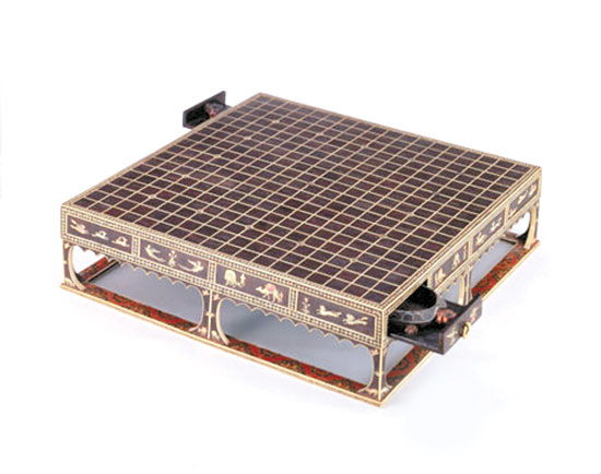 被称为“正仓院的宝物”、“最古的棋具”。该棋具由紫檀木制,呈盒形棋盘线路由牙质精工镶成,在十九道的盘面上嵌有十七个星位,棋匣状如抽屉呈龟形,棋子玉质上绘有鸟形,制作精良。