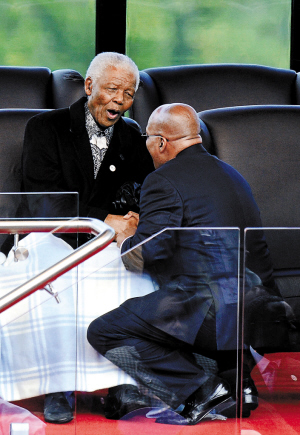 南非废除种族隔离后的前三位总统曼德拉、塔博·姆贝基和代总统卡莱马·莫特兰蒂全都到场。曼德拉落座后,祖马蹲在他身前,向他问好,表达敬意。