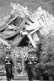 伴随着深情的《献花曲》,20名礼兵抬起10只花篮,正步缓缓走向四川汶川特大地震纪念表盘,将花篮整齐摆放在纪念表盘前