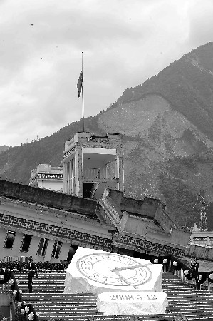 学校工作人员告诉记者,国旗在地震前不在目前这个位置,而是西侧的楼顶,因为楼梯没有变形,且保持了直立,有关部门才确定把国旗旗杆迁移至此。
