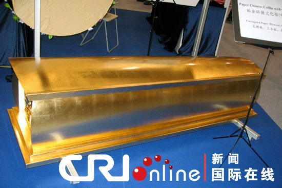 国际在线消息(驻香港记者梁建军):第二届亚洲殡仪博览会目前正在香港举行,参展商推出了用瓦楞纸和三合板制作并在表面贴以金箔的纸质棺材,既环保又显档次,成为最具特色的展品之一。