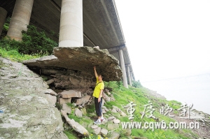 昨上午,记者来到现场。这里地处长江边,受斜坡影响,其上方的南滨路均采用水泥钢筋桥墩支持的高架桥方式建成,悬空桥墩靠江边,顺坡而上还有另外2根。