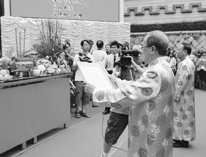 乐止,一仕女端祭文上,大陆主祭人献上祝文。“两岸同胞,云集皓月园,敬备香花素果,致祭于延平郡王雕像前而告慰曰:巍巍晃岩,翠柏凝峰,滔滔鹭江,波浪奔涌。遥想当年,国姓成功,立足金厦,跨海征东。攻坚克险,士气恢宏,驱除荷虏,复土建功……”