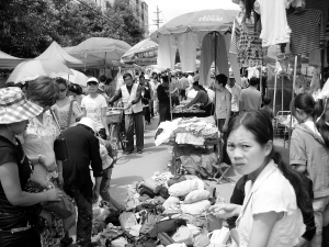 沿路的摊贩非常多,道路几乎被一个紧接着一个的摊位挤占满了。而这些地摊多是由一块油布铺地而成。赶街的人左躲右避,穿梭于摊位之间。摊贩们则站在各自摊位上,或用小喇叭、或敲打着自己的商品,吸引顾客关注。街上卖碗的、卖铁马掌的、卖服装的、卖烟筒的,各式各样的东西都应有尽有。