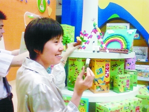 玩具也能吃?您别不信。在昨天的展会上,记者就见识了一种能吃的玩具——来自德国的“粘粘乐”。其外形像一粒粒大号爆米花,有各种颜色,每个包装里有成百上千个彩色“爆米花”。它们一沾水就变得像胶水一样粘,还很容易剪切、挤压和塑形,可以像拼图一样拼接成各种平面的、立体的图案。据介绍,“粘粘乐”是用玉米和土豆淀粉发泡制成的,堪称纯天然的绿色玩具,添加各种食用色素后就拥有了丰富的色彩。这种玩具不仅安全无毒,甚至还能放到嘴里吃,口感跟爆米花差不多。一位年轻妈妈说,她一岁半的女儿总喜欢把东西放到嘴里咬,像“粘粘乐”这样的玩具,就算不小心吞下去也不会产生严重伤害,把玩具的安全系数提到了一个新高度。