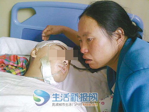 朱玉昌夫妇守在病床边已经一个礼拜了,困了就在躺椅上靠一下,饿了就吃点亲戚送来的食品,他们说自己已经身无分文。手术后第三天,朱玉昌回家凑钱,卖了仅有的4头小猪得了5000元钱,却在昆明东站遭遇丢包诈骗。家属表示,孩子是在学校补课时出的事,学校肯定要负责任的。