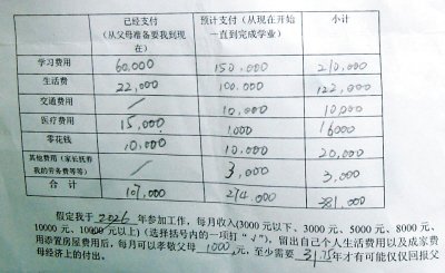 记者:据这次活动的策划人介绍,他们这次的活动是为了将学校的教育延伸到家庭,把学校教育和家庭教育结合起来,让孩子们体会到父母养育自己不容易,也让孩子们学会感恩,希望孩子们对自己各方面的开销有一个更加清楚的开销,这是一个明细帐,通过自己的花消可以勤俭节约,同学们填写的回报父母的年限上有的说是5年、10年,有的是30年,答案是不等的,其中有一个预计完成学业父母将花费总费用在82万的同学,如果每月按照孝敬父母一千元的额度来算的话要70年才能够回报完父母在培养自己的过程中经济上的支出。