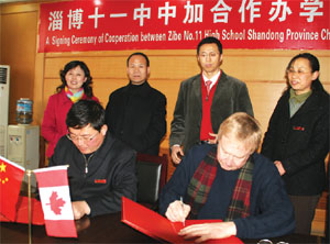 淄博十一中校长乔秀波和加方代表罗杰先生签署合作意向书