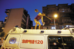 小贩站在急救车顶,挥舞着铁铲,不让人靠近 记者曲鸣飞/摄