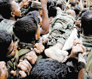 躺在斯北部穆莱蒂武“安全区”一侧南蒂卡达尔湖岸边的“虎首”身着猛虎组织军服,双眼圆眼,身上布满弹孔。