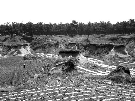 “下一场雨就能冲掉不少”,17日,在遗址附近为花生除草的村民徐芝芳说,以前这些“红土山”都是连接在一起的,而现在许多山丘都从中间断开了,零零散散地卧在沟底,规模小了很多。