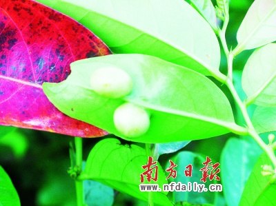 蔡先生所称的“怪树”,长在清溪莞香园半山腰的凉亭边。外表看来它只是普通的树种,枝叶比较茂盛,叶子和茶花树的类似。但仔细一看,就发现了它的怪处:树叶背面长了不少豌豆大小的青色“果子”。有的叶子只结一两颗,有的则密密麻麻结成一串。摘下一颗用刀切开,里面有一颗中空的硬核。