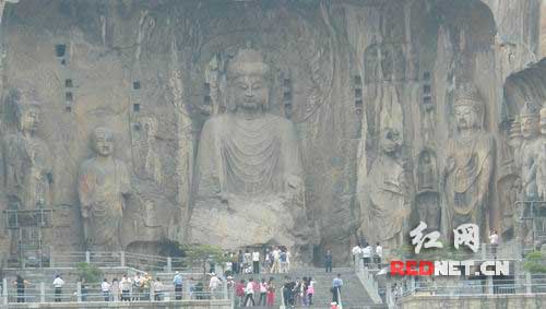 游客从高陡的石阶攀登而上,巨大的石佛头像一点点显露出来。红网洛阳5月26日讯(记者 曾小颖)此间青山绿水、万象生辉,伊河两岸东西山崖壁上的窟龛星罗棋布、密如蜂房。不同于早期石窟佛像的粗犷敦厚,这里的石佛服饰已然是中原汉民的褒衣博带,眉目神情也从魏晋风流的“清瘦俊逸”渐至盛唐的雍容富态。洛阳龙门石窟开凿于公元五世纪末至十世纪末之间,有历史学家认为,这五百年间中国的历史在龙门石窟留下了深刻的烙印。26日下午,第八届网上看河南采风北线采访团一行来到洛阳,红网记者将带您去看看龙门石窟。