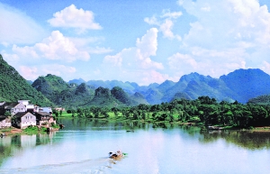 连江经过阳山县城,再向下10多公里,到达水口镇前后的一段水域,是连江山水景色之冠,连江流到此地,转了个九十度的大弯。两岸山峰起伏,各显秀姿;峭壁上钟乳琳琅;中间是翠绿的田园、古旧的民居,构成一幅淡雅清秀的山水画卷。