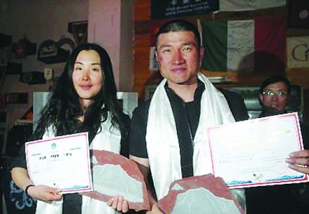 5月22日,来自大连的夫妻林涛和赵阳在拉萨从西藏自治区登山协会负责人手中接过了珠穆朗玛峰登顶证书。林涛说:“珠峰接纳了我们,相信以后的生活会更加幸福。”