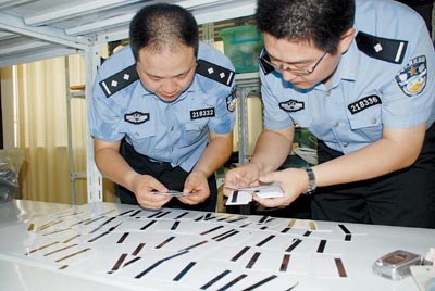 警察在清点查获的银行卡。记者王业全摄