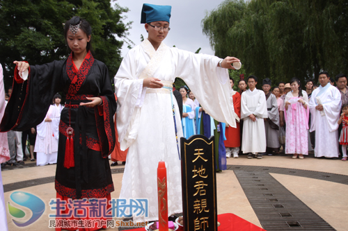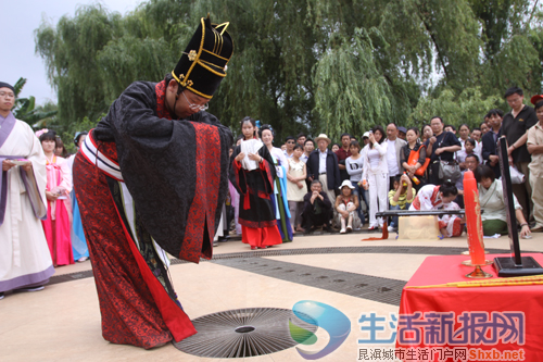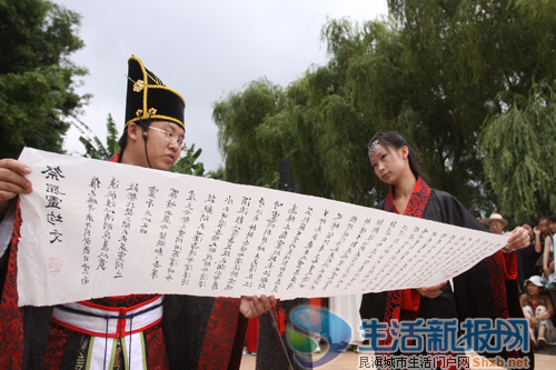 下午4点,祭祀活动正式开始。在汉服群成员李小姐用古琴弹奏的一曲《普庵咒》中,50多名青年男女面向九龙池,向上书“天地君亲师”的牌位行二拜六叩之礼,并咏诵《离骚》。随后,主祭人“逍遥”朗读主祭文。据了解,这篇380字的主祭文是昆明市第12中学一名16岁女生小付在查阅了《史记》、《楚辞》、《祭石曼青文》等古代文学作品后,花了近4天时间创作完成的。