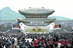 据新华社首尔5月29日电 29日是韩国为已故前总统卢武铉举行国民葬的最后一天。当天上午,在首都首尔市中心景福宫举行了规模空前的遗体告别仪式。数十万民众涌上街头送别这位“平民总统”。韩国总统李明博,前总统金泳三、金大中等2000多人出席遗体告别仪式。